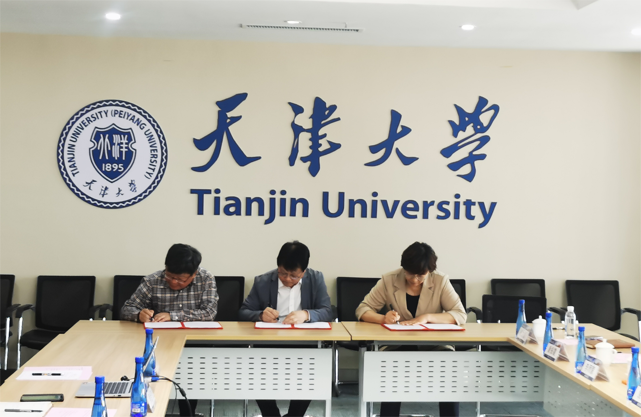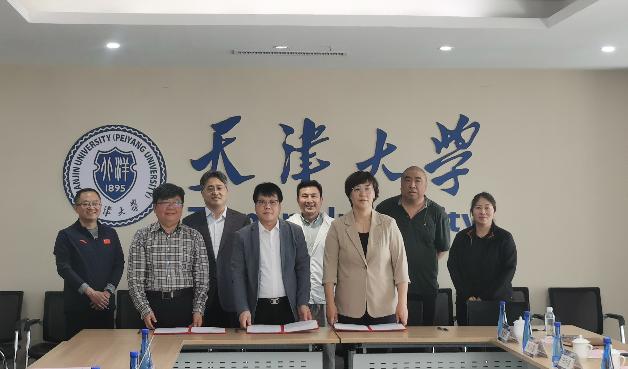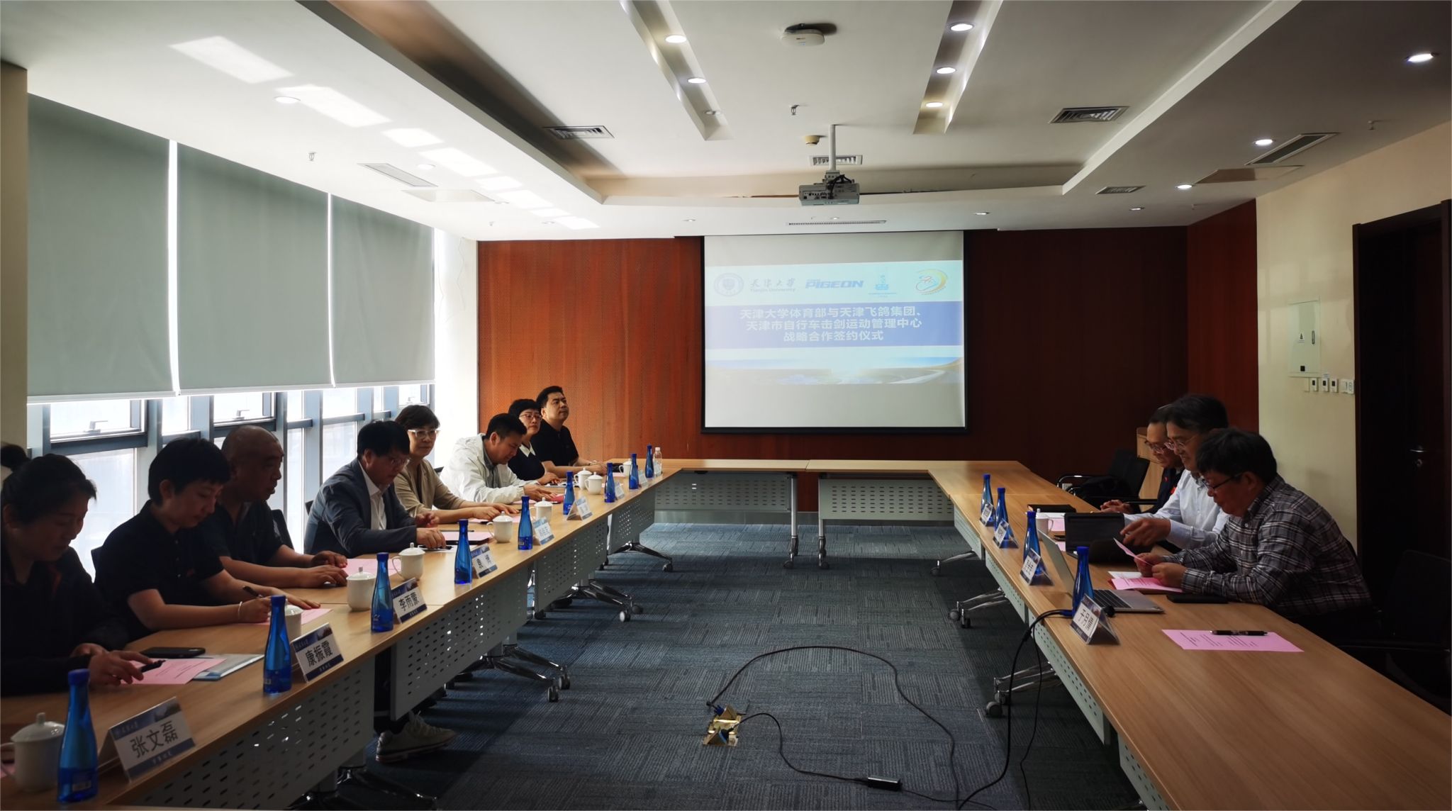 本站讯(通讯员 于月倩)4月17日下午,体育部与天津市飞鸽集团、天津市自行车击剑运动管理中心战略合作签约仪式在天津大学北洋园校区行政服务中心A201会议室举行。校党委副书记韩庆华,天津市飞鸽集团有限公司党委书记、董事长韩桂友,副总经理袁博,天津市自行车击剑运动管理中心主任陈华,副主任刘建军,体育部党总支书记、主任吴金克,以及双方相关负责同志参加签约仪式及座谈会。会议由吴金克主持。