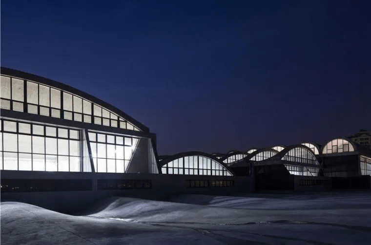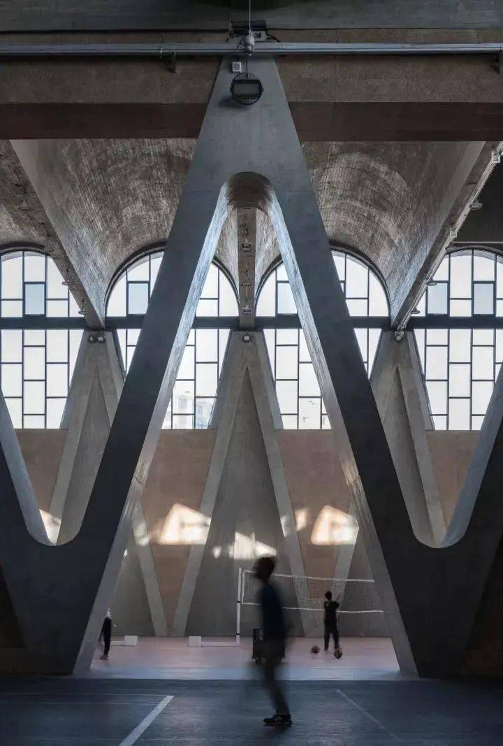 运动场地空间的屋顶和外墙,使用了一系列直纹曲面、筒拱及锥形曲面的钢筋混凝土结构,带来大跨度空间和高侧窗采光,充分展现了大学校园内的体育建筑具备的活力和朝气。