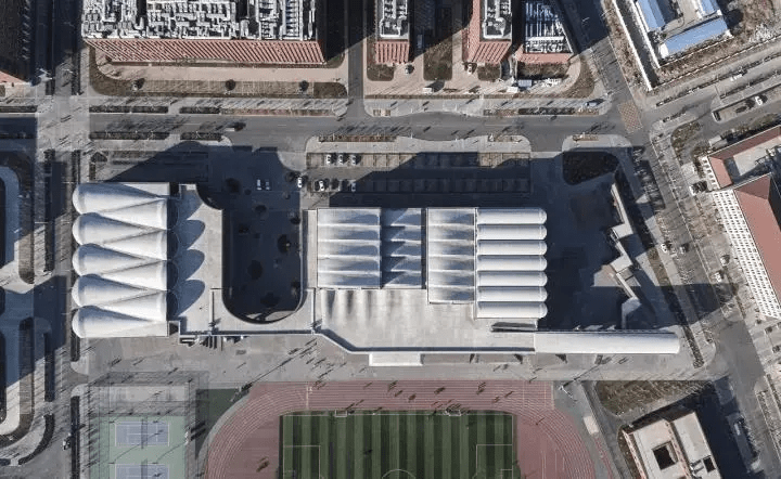 室内体育中心的公共大厅屋面采用了波浪形渐变的直纹曲面形屋面,其东侧长达140米的室内跑道,不仅为大厅带来凸显屋面形状的自然光线和向远处延伸的外部景观,而且那些奔跑于架高跑道上的人,也成为可由室内外空间中欣赏的独特风景。