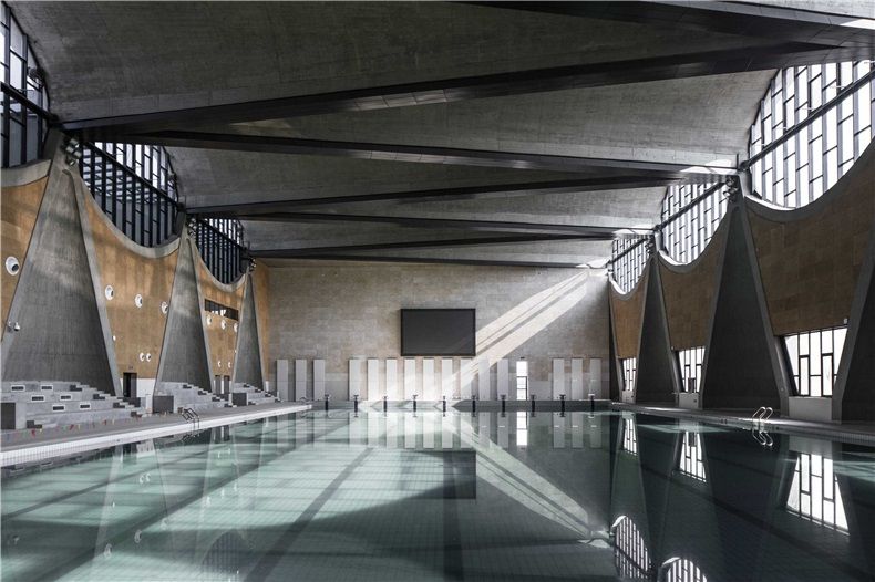 在建筑摄影大奖的画面中,摄影师巧妙地捕捉到游泳馆室外光束穿过天窗与水体相辉映的画面,充分的展现了馆内光影的魅力。也突出了的设计师的设计理念——景胜几何。体育馆的设计强调“在几何逻辑控制下对建筑基本单元形式和结构的探寻,重复运用和组合这些单元结构,以生成特定功能、光线及氛围的建筑空间。”通过直接大胆的结构产生的建构之美,以及由此带来的沉静、朴素和富有韵律的空间,则呈现出一种更加恒久的特征和诗意。让学生在运动的同时收获美带来的愉悦。