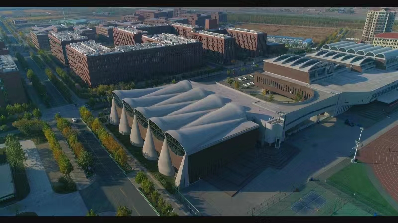 从正面看,有一处凹陷,仿佛被拳击手打了重重一拳,似乎一场拳击比赛正在进行。远远望去,波涛起伏的波浪形屋顶仿佛连绵起伏的山丘,无限延伸到远方。这个颇具动感的建筑,就是天津大学新校区体育馆,这把独特新颖的发令枪,把拼搏进取、积极向上的精神传递给在天大求学的莘莘学子。